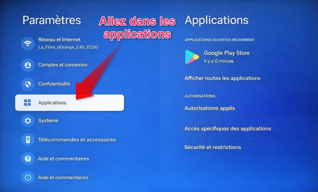 La section Applications permet de trouver et installer différentes applications disponibles pour Android TV.